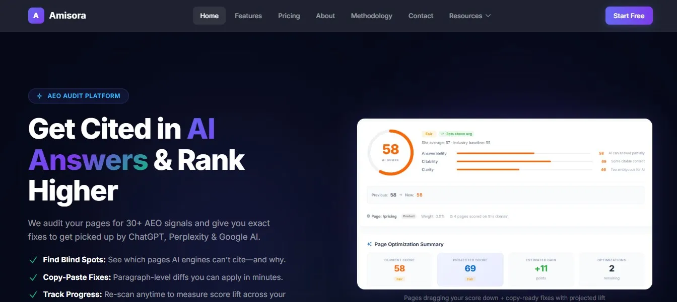 Amisora audits your site for AI visibility and shows what to fix so ChatGPT, Perplexity and Google AI can cite you more often.