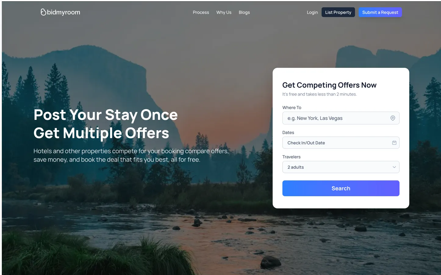 BidMyRoom is a competitive bidding platform that revolutionizes hotel and accommodation bookings, particularly for group travel, corporate stays, and individual trips. Users submit their stay requirements once, and hotels and other properties compete directly by sending tailored offers and bids to their dashboard. This process allows travelers to compare rates, amenities, and value side-by-side, securing the best deal without endless searching or middlemen, ultimately saving time and money.