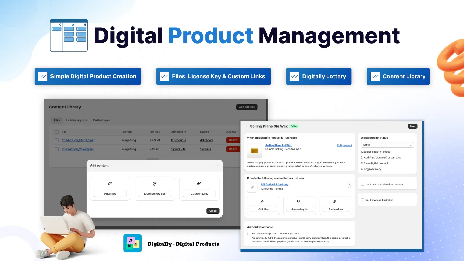 Digitally is a Shopify app that helps merchants sell and automatically deliver digital products such as PDFs, eBooks, software, license keys, videos, courses, and download links. It handles everything from uploading files to instantly sending them to customers after purchase.