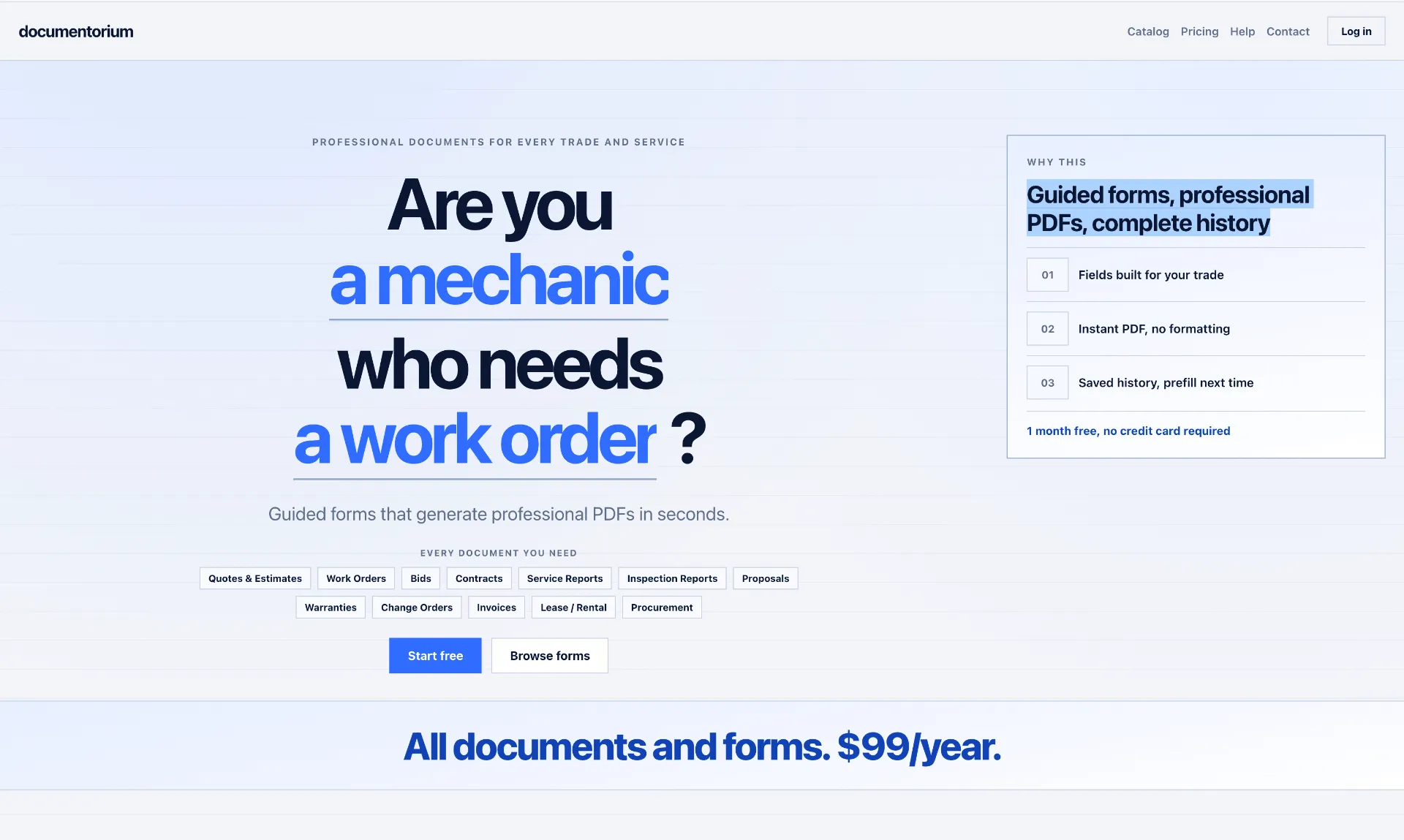 Documentorium turns job-site chaos into polished PDFs. Build error-free estimates, invoices, work orders, contracts and inspection reports through guided step-by-step forms—no Word or Excel wrestling required.