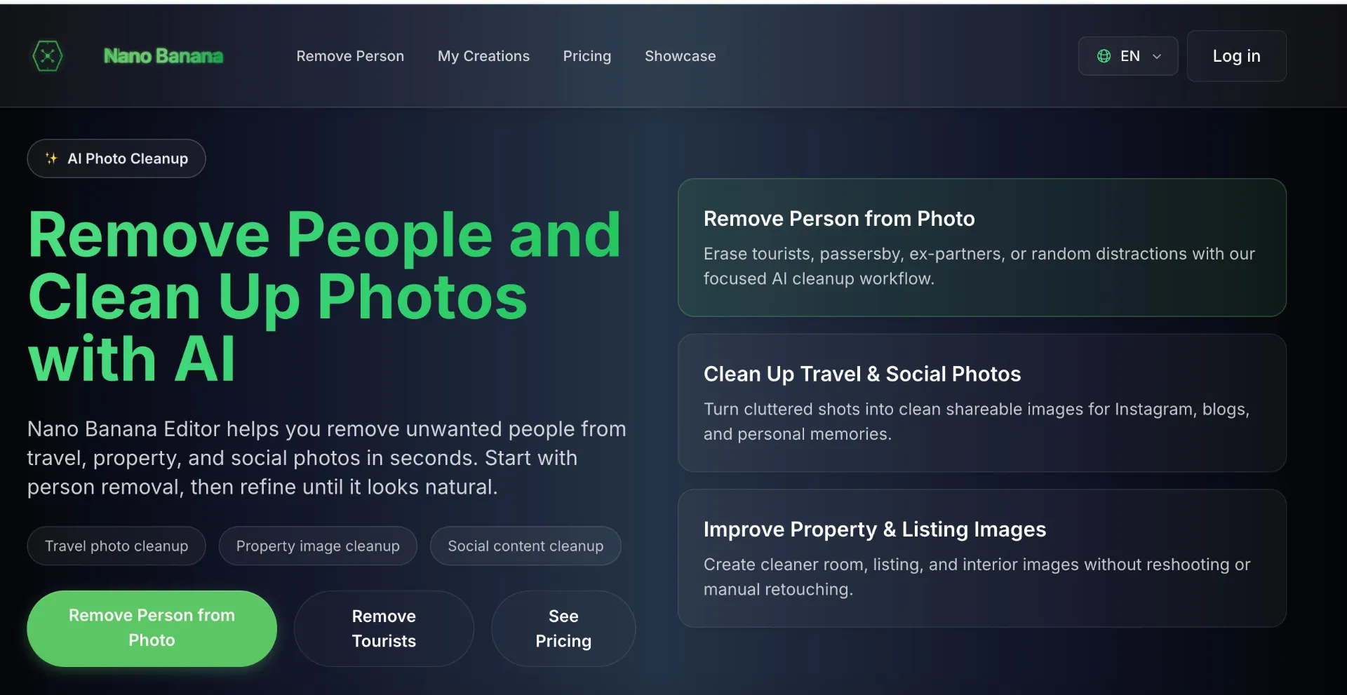 Nano Banana Editor is an AI photo tool focused on one practical task: removing unwanted people from images.