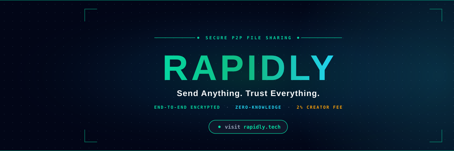 Rapidly is browser-based P2P file sharing. Files fly directly device-to-device over end-to-end encrypted WebRTC channels. Nothing ever touches our servers. No accounts. No file size limits. No ads.