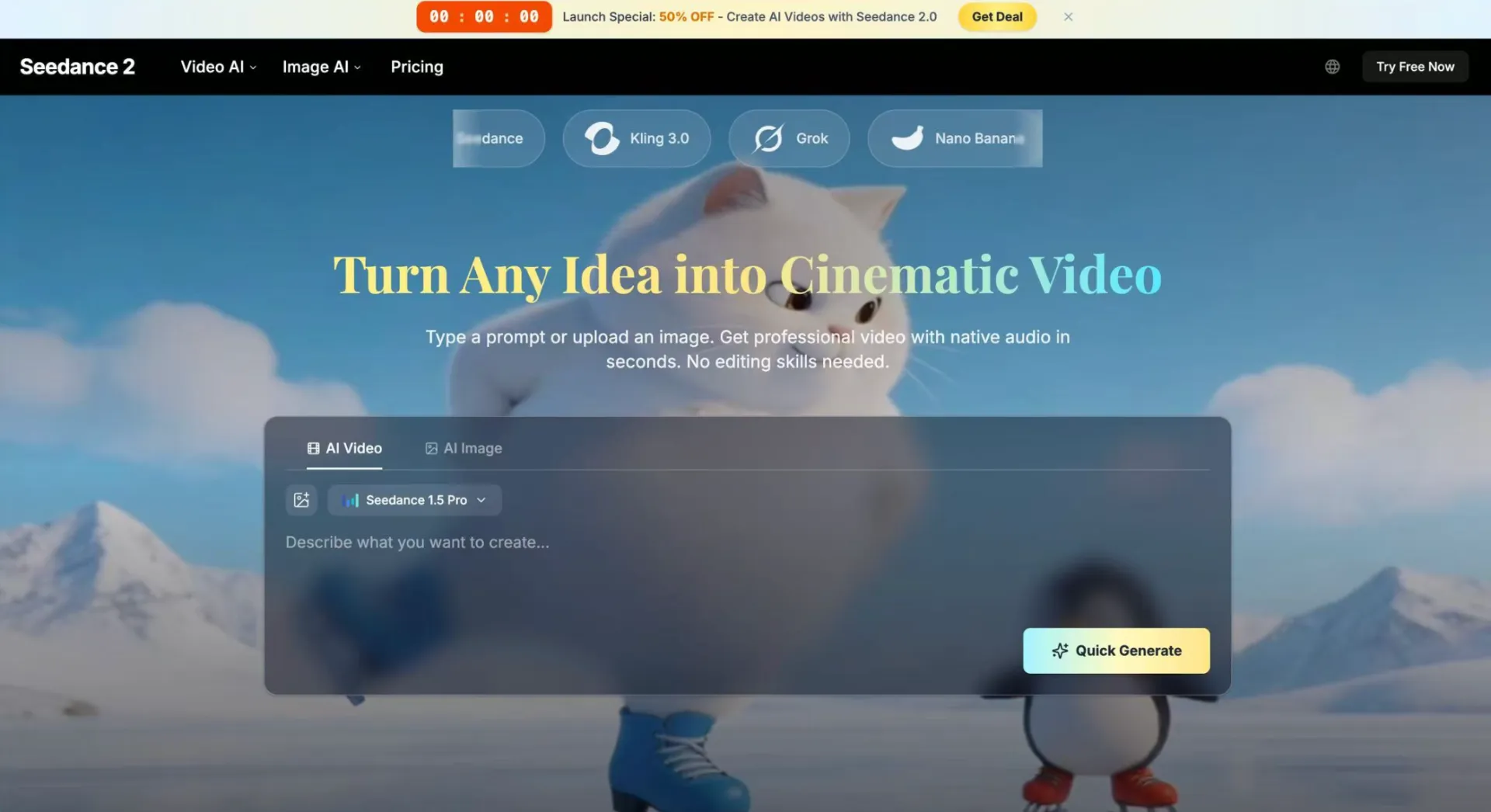 Create cinematic AI videos instantly with Seedance 2.0 — from text, images, or audio.