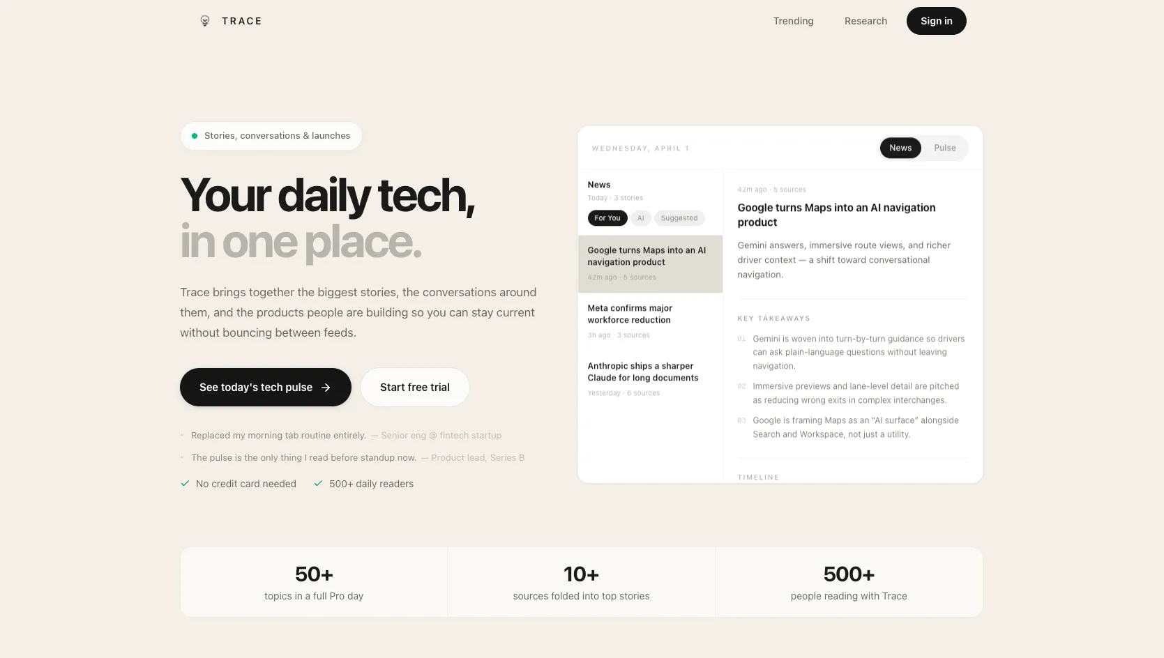 Trace brings together the biggest stories, the conversations around them, and the products people are building so you can stay current without bouncing between feeds.